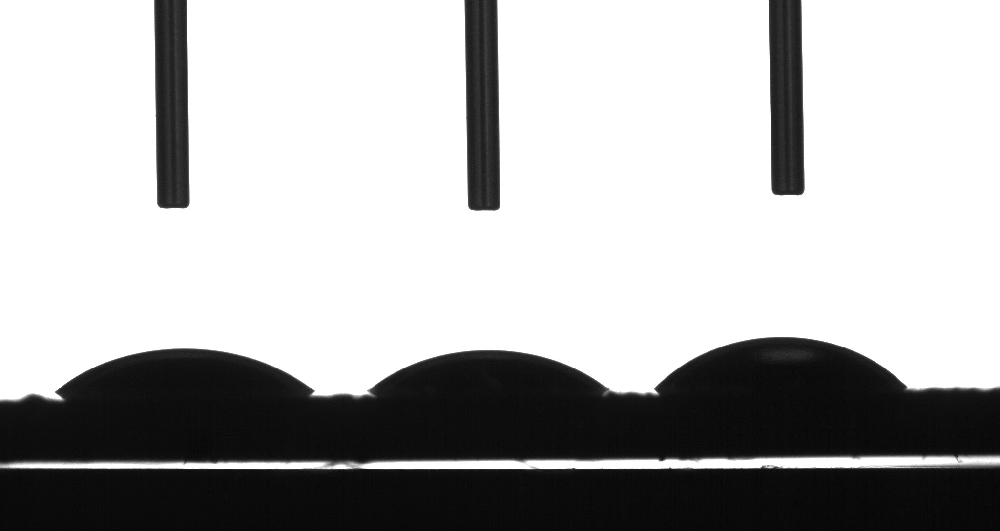 一個(gè)相機(jī)拍下三張液體圖片并同時(shí)計(jì)算接觸角。